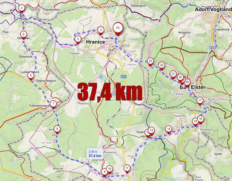 Trasa je, jako každý rok, vedena přes tři sousedící státy, Česko, Bavorsko a Sasko. Občerstvení je letos připraveno v sokolovně v Krásné, kde každý účastník cyklovýletu dostane zdarma po předložení kupónu polévku! Další možností je Ve školce v Podhradí a U Jany v Doubravě. Cíl je v hranické sokolovně, kde pak na každého účastníka čeká jako obvykle grilovaná klobása. Budeme jen doufat, že nám bude přát počasí.