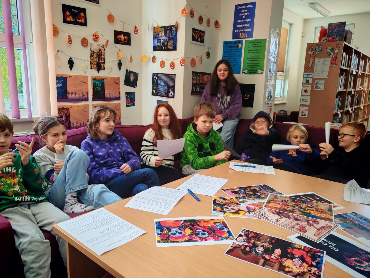 Vyrobili jsme si masku catriny, k výrobě se přidala i paní učitelka. Na závěr nechyběla hrabárna v knížkách se strašidelnými příběhy. S nějakým čtením odešel skoro každý.