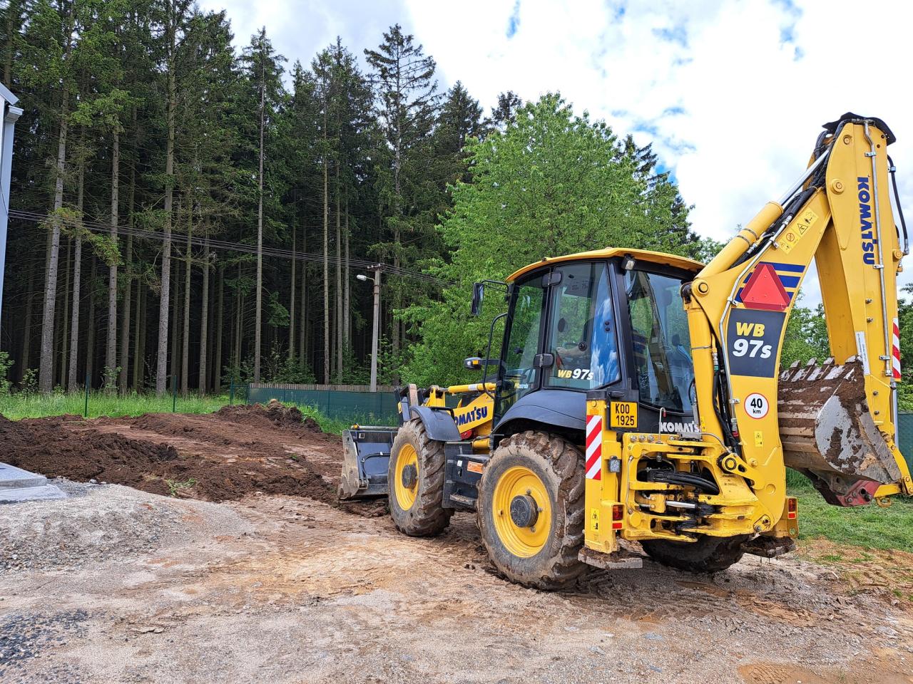 Mimo to nám tam jezdí bagr a upravuje terén. To se totiž ukázalo, že bude ve vlastní režii mnohonásobně levnější. Vedle kabin tak vzniká zpevněná plocha z použitého kameniva okolo stavby a vykopanou zeminou se zase srovnává okolí.