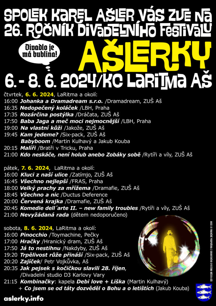 A koho politika nebaví, tak si zajeďte do Aše na Ašlerky, což je skvělý divadelní festival, kde hrají profíci i amatéři, ale většinou nerozenáte kdo je kdo. A je tam moc příjemná atmosféra. Navíc v sobotu v 5 hodin vystupuje hranický dramaťák s hrou Hračky.