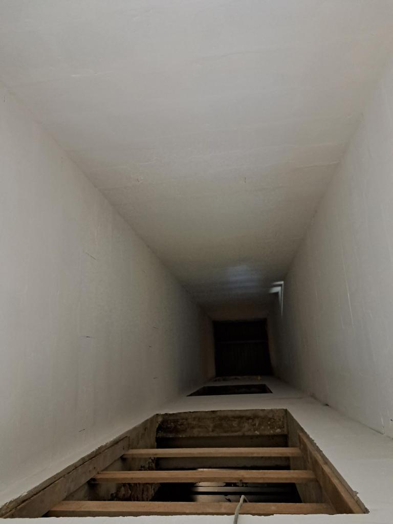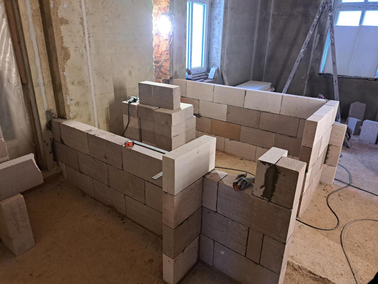 Uvnitř jsou dokončeny hrubé omítky, výtahová šachta, je zateplená střecha, nové stropy a probíhá zdění a montáž příček.