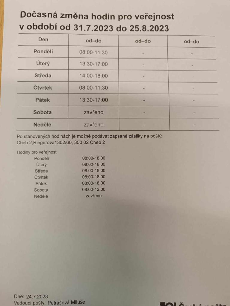 Pošta Hranice oznamuje změnu otvírací doby od 31.7. do 25.8.2023 a to: