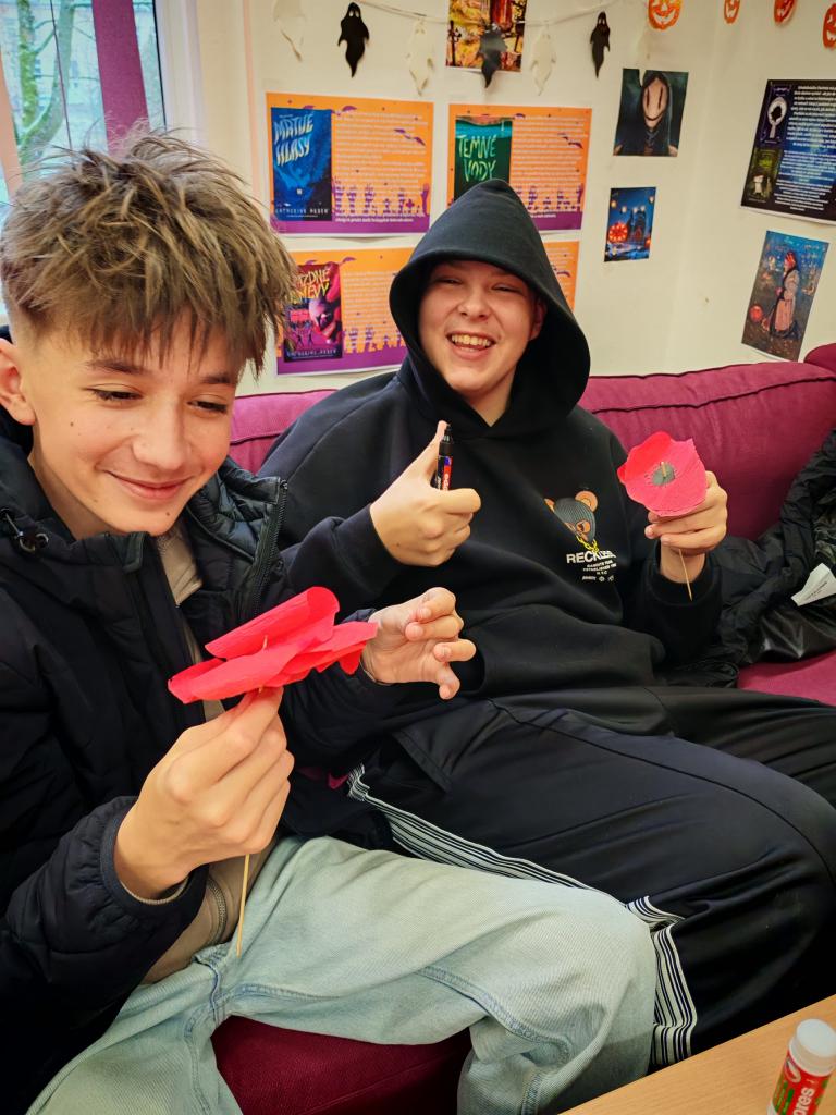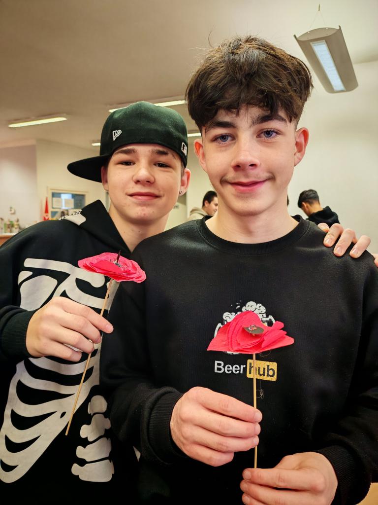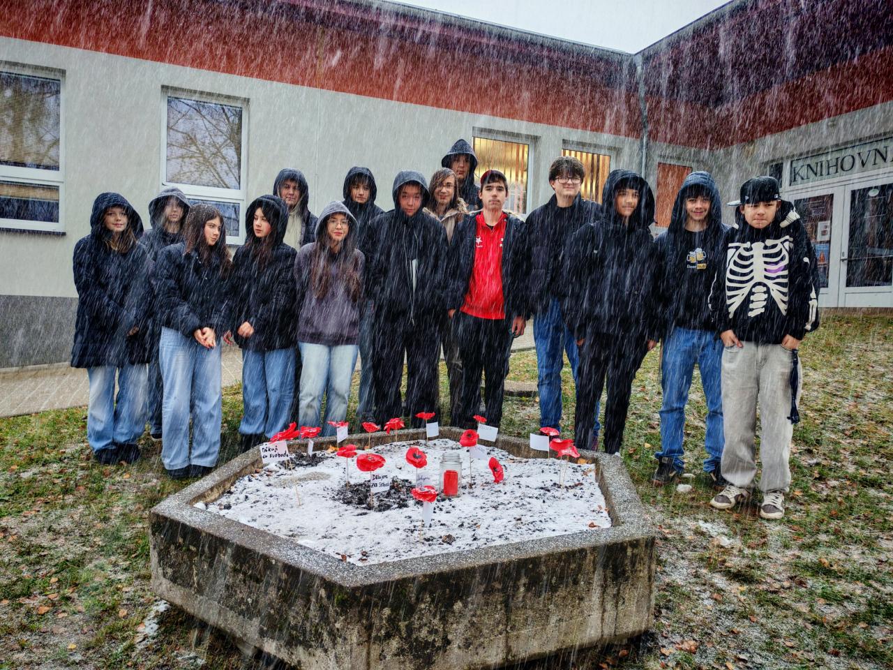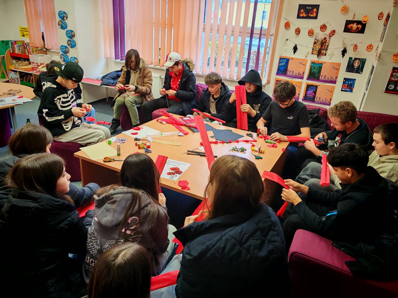 Do knihovny dorazila devátá třída, abychom si popovídali o tom, proč jsou vlčí máky symbolem Dne veteránů. Shrnuli jsme si 1. světovou válku, kdo je to vůbec válečný veterán, vznik básně Na polích flanderských a doslova na koleni vyrobili vlčí máky se vzkazy pro padlé, které jsme v menší sněhové přeháňce zapíchali před knihovnu.