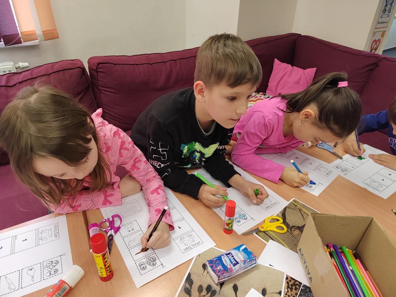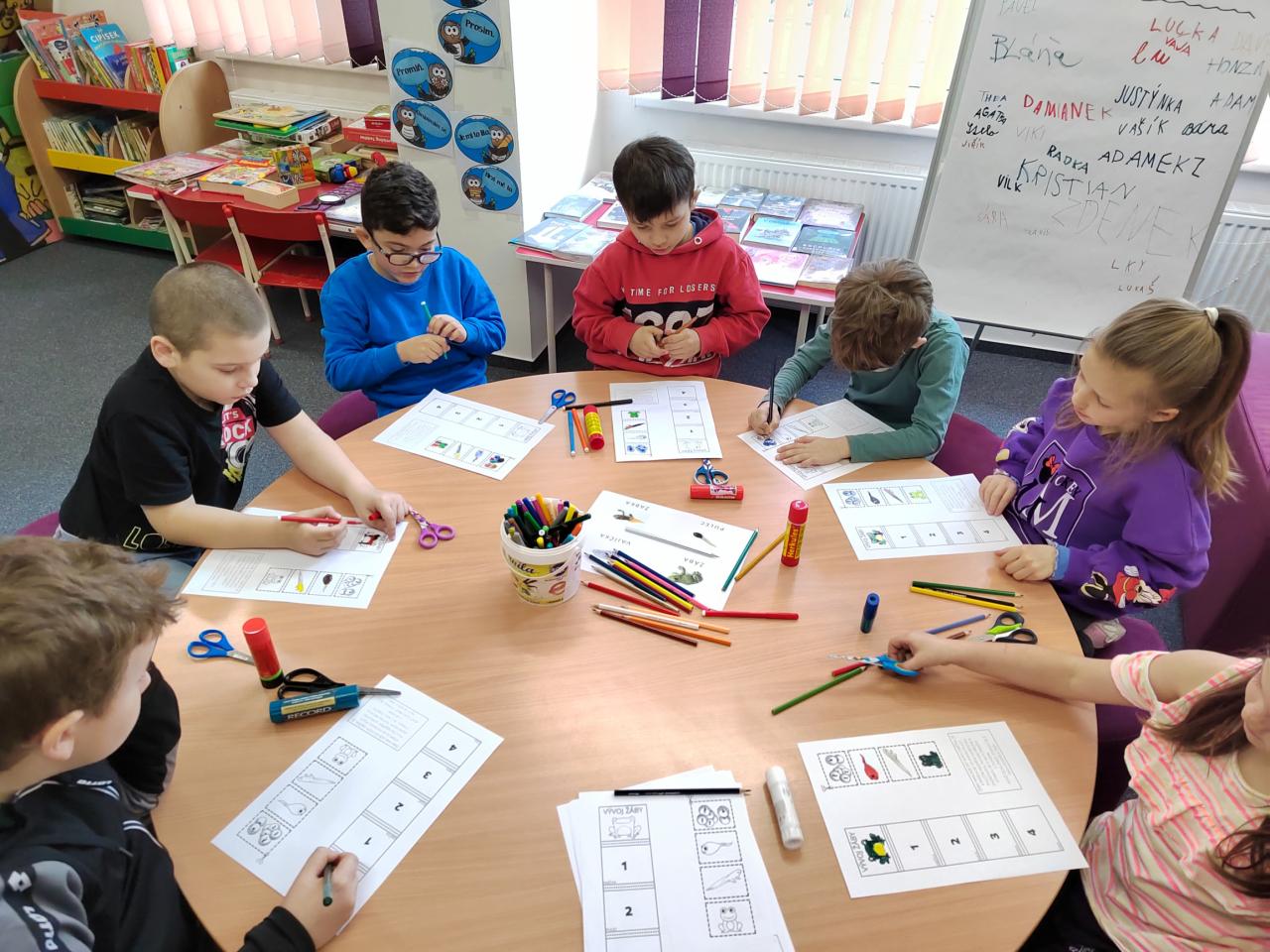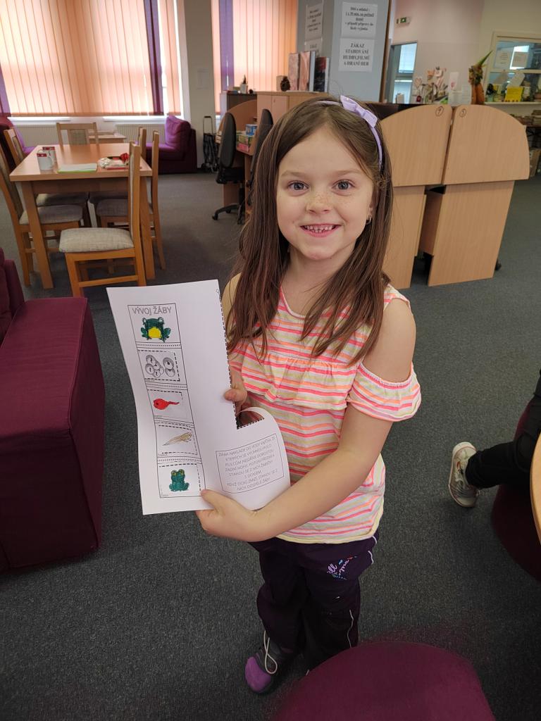 Březnová návštěva první třídy v knihovně - téma žáby. Přečetli jsme si pohádku o Kvakovi a Žbluňkovi, ukázali si druhy žab včetně vývoje od vajíčka po žabičku, vyrobili žabí záložku do knížky a frkací žábu.