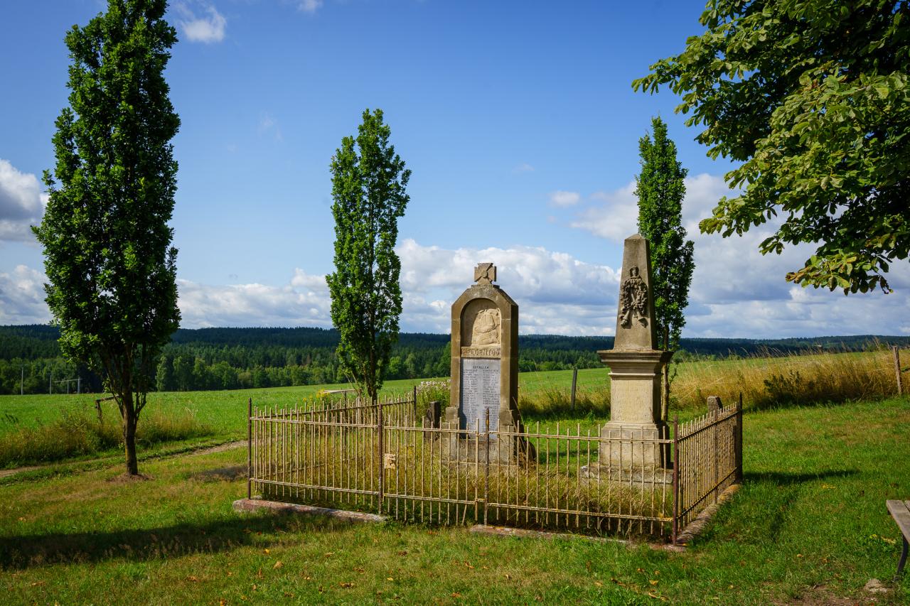 Starší z pomníků, zdobený obelisk, byl odhalen 3. července 1892 v předzahrádce tehdejší školní budovy (jejíž historickou fotografii můžete vidět na informační tabuli). Připomíná památku dvou mladíků z Gottmannsgrünu, Johanna Rittera a Johanna Fuchse, kteří padli v Prusko-rakouské válce roku 1866. Jejich jména jsou tichou připomínkou dřívějšího konfliktu, který ovlivnil životy zdejších rodin.